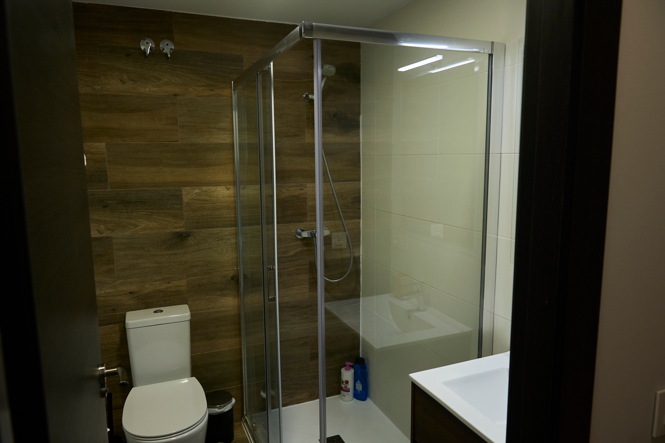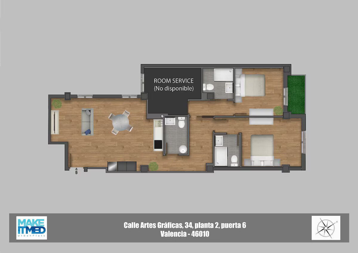 It has a room with a 150cm double bed and a bathroom with a shower, and another room with a 135cm double bed and a bathroom with a shower. Air conditioning in one room and the living room. Fan in the other.