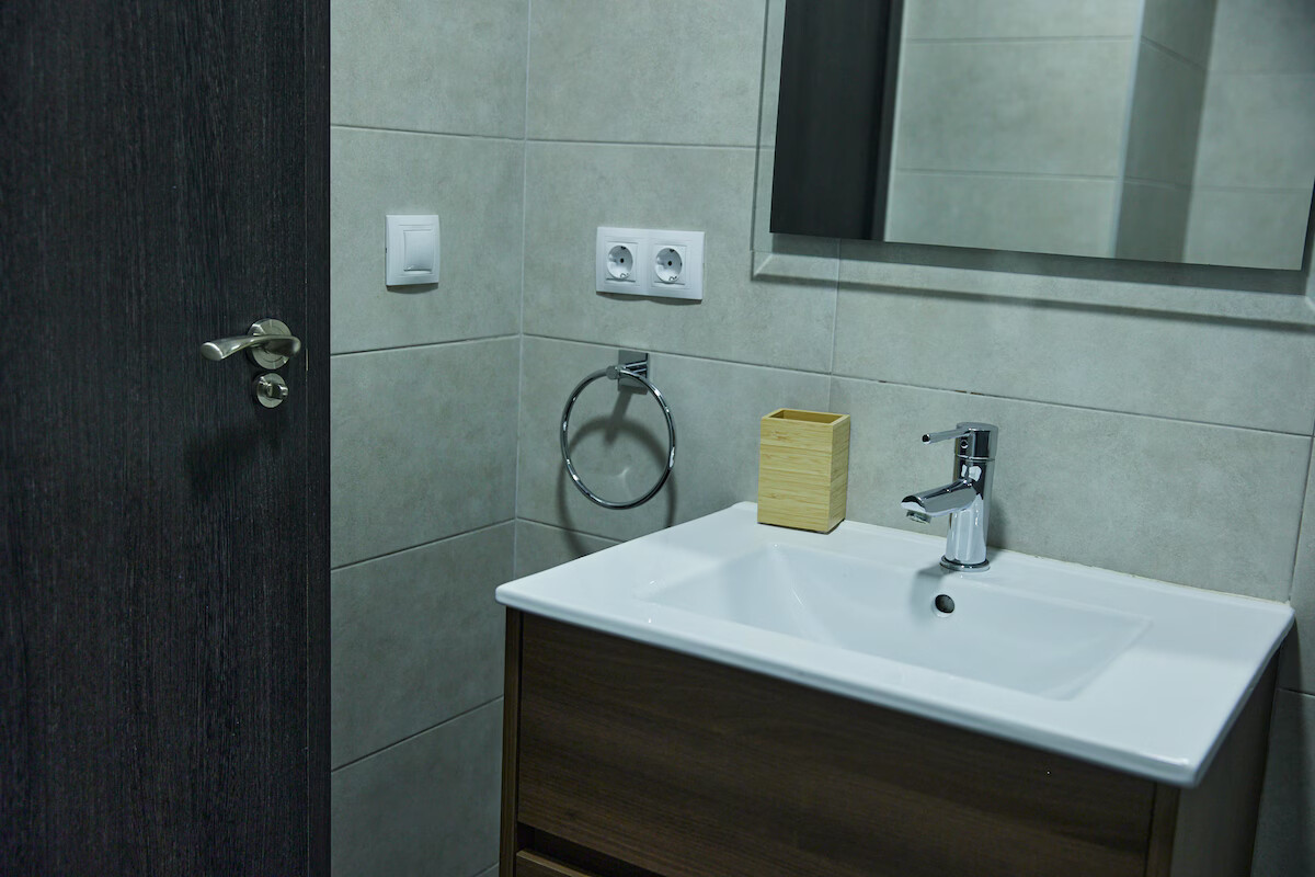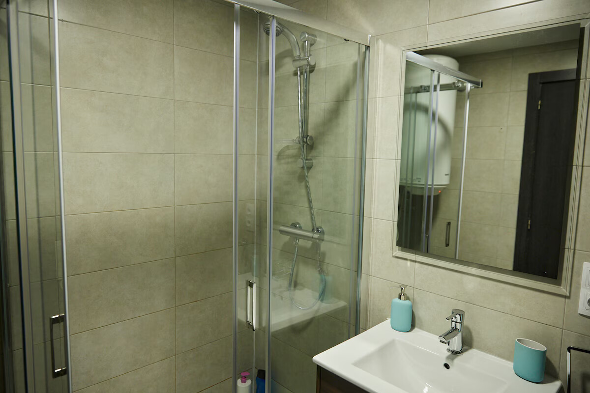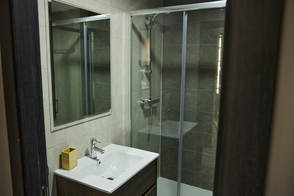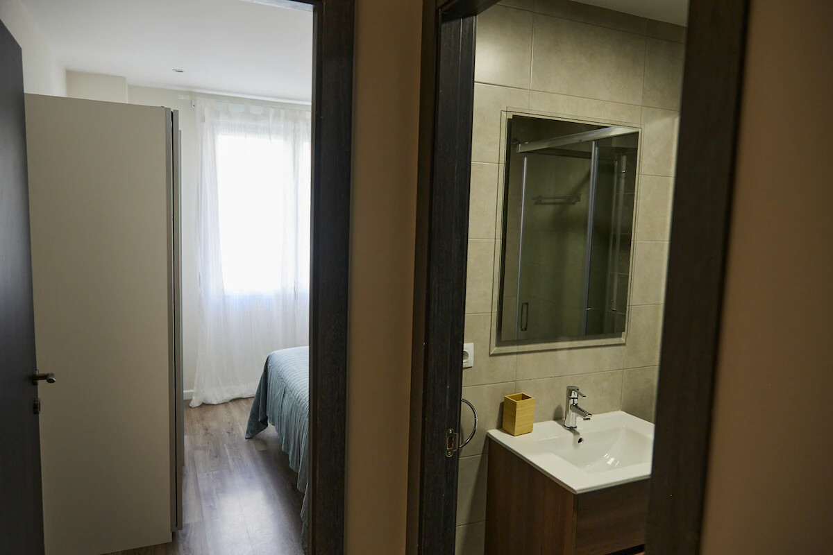 It has a room with a 150cm double bed and a bathroom with a shower, and another room with a 135cm double bed and a bathroom with a shower. Air conditioning in one room and the living room. Fan in the other.